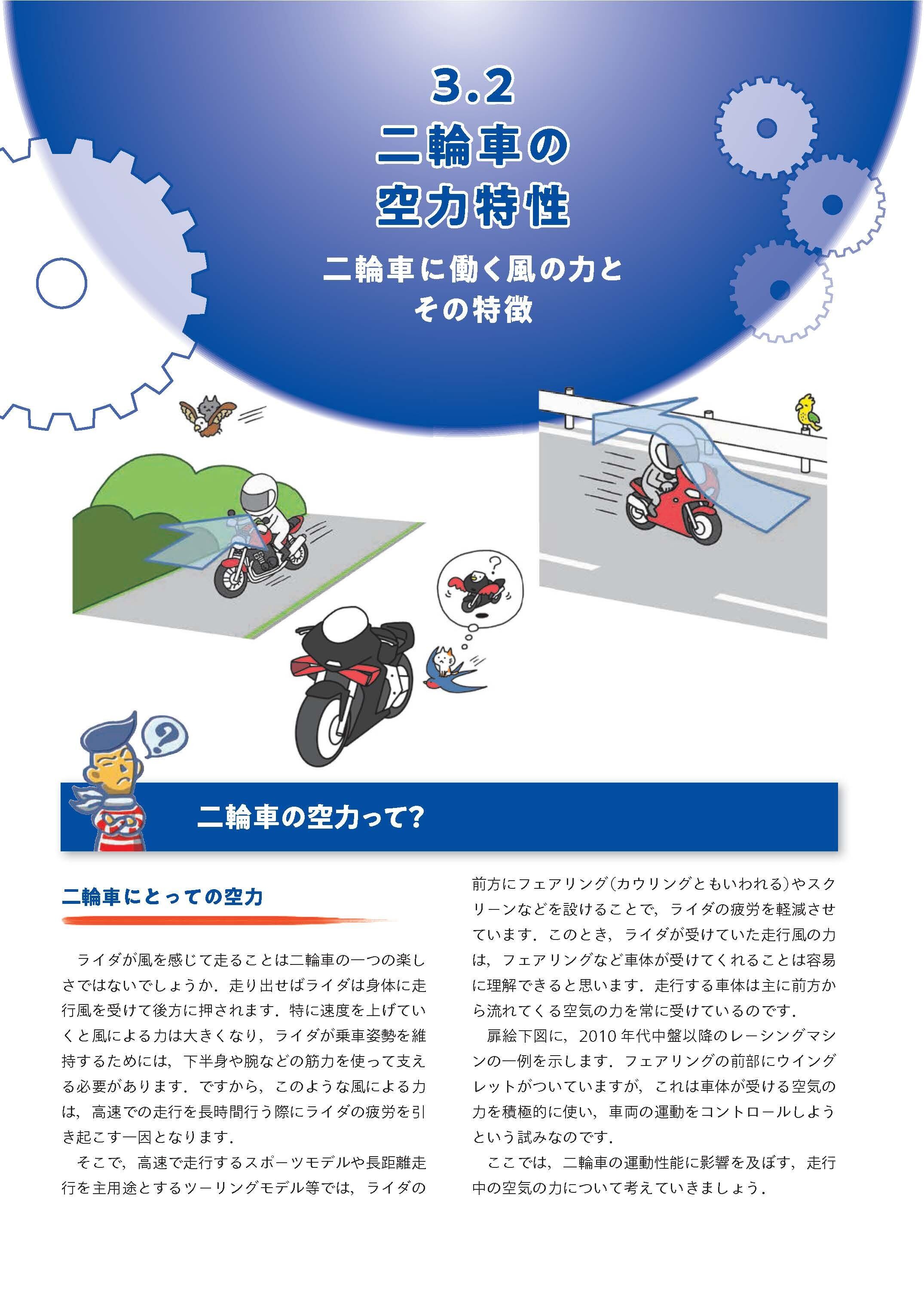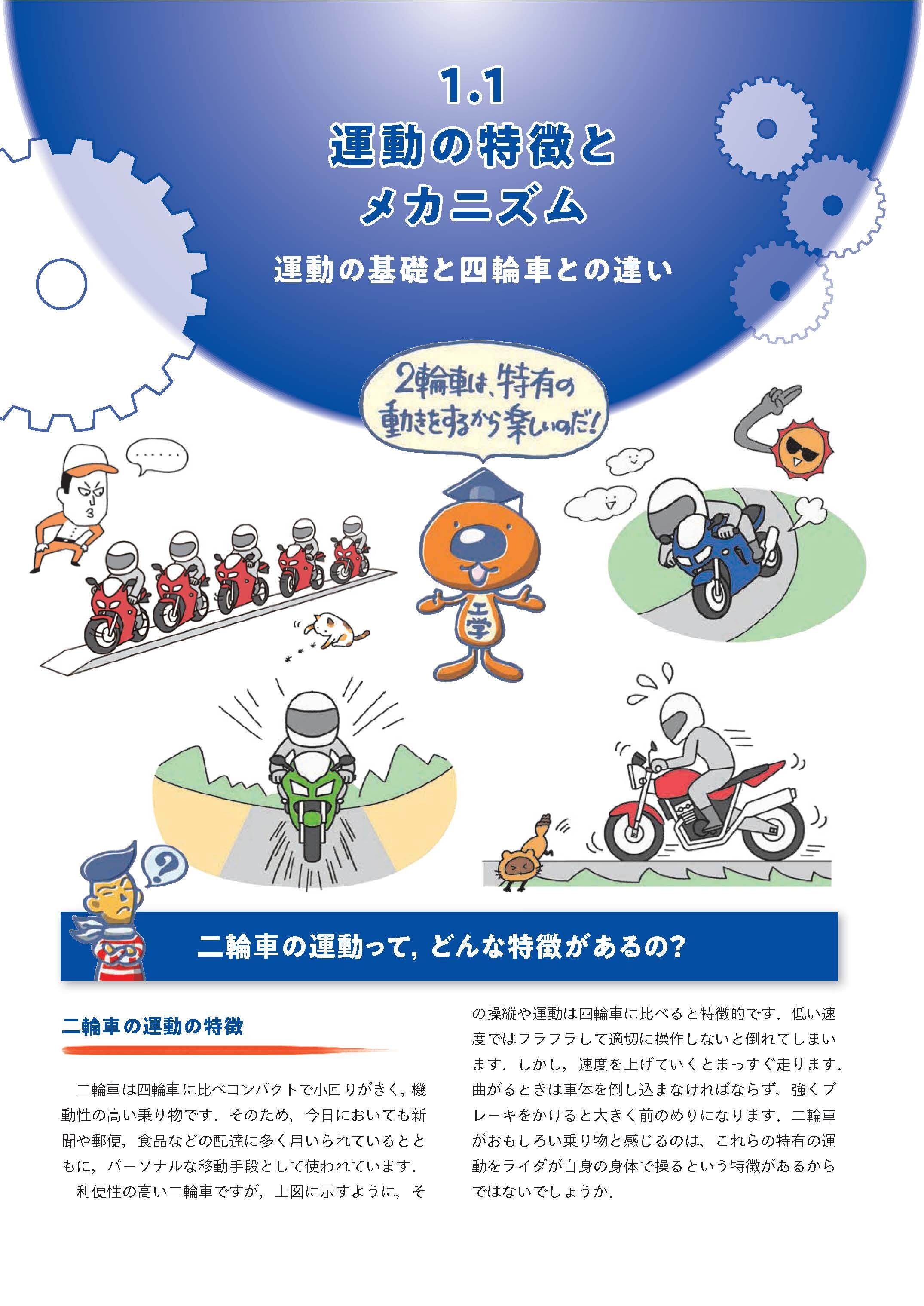 「二輪車の運動性能」「タイヤ工学」「人間・二輪車系」「サスペンション」「ブレーキ工学」といった内容を、誰もがその面白さに気づいていただけるよう、シンプルなイラストを大きく配し、専門用語を極力避けて平易な言葉で説明するなど、読みやすい内容となっています。
